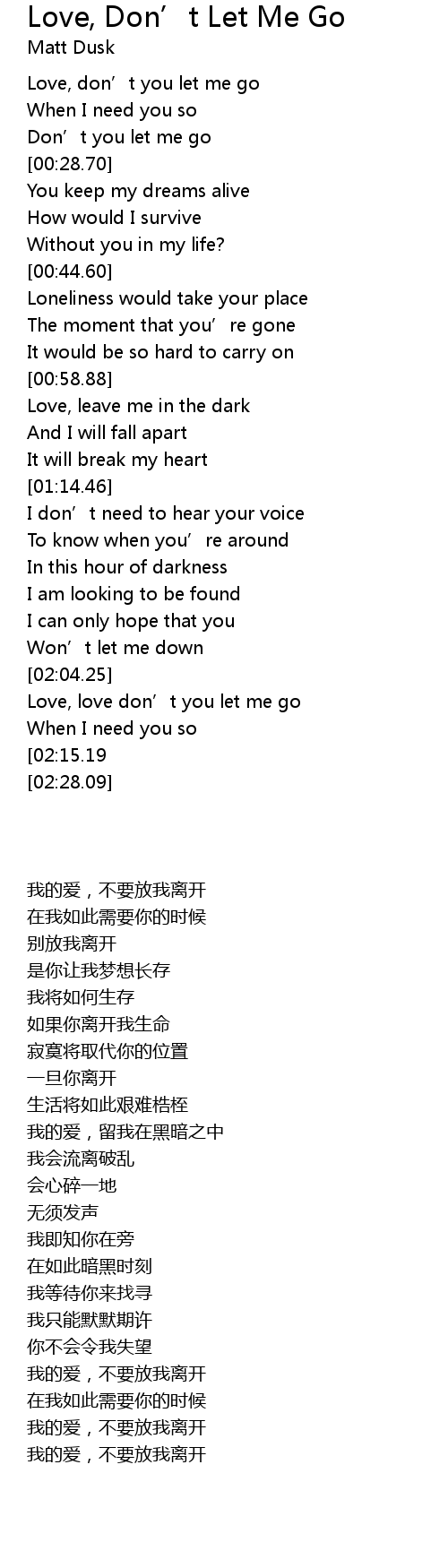| [02:20.68][02:15.19] | Love, don’t you let me go |
