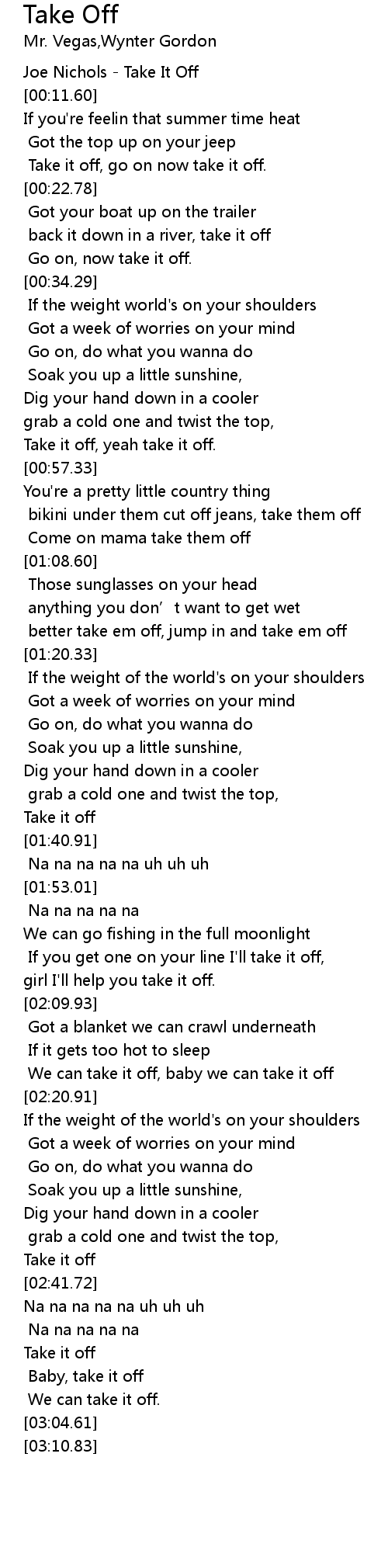 | [01:02.17] | bikini under them cut off jeans, take them off |