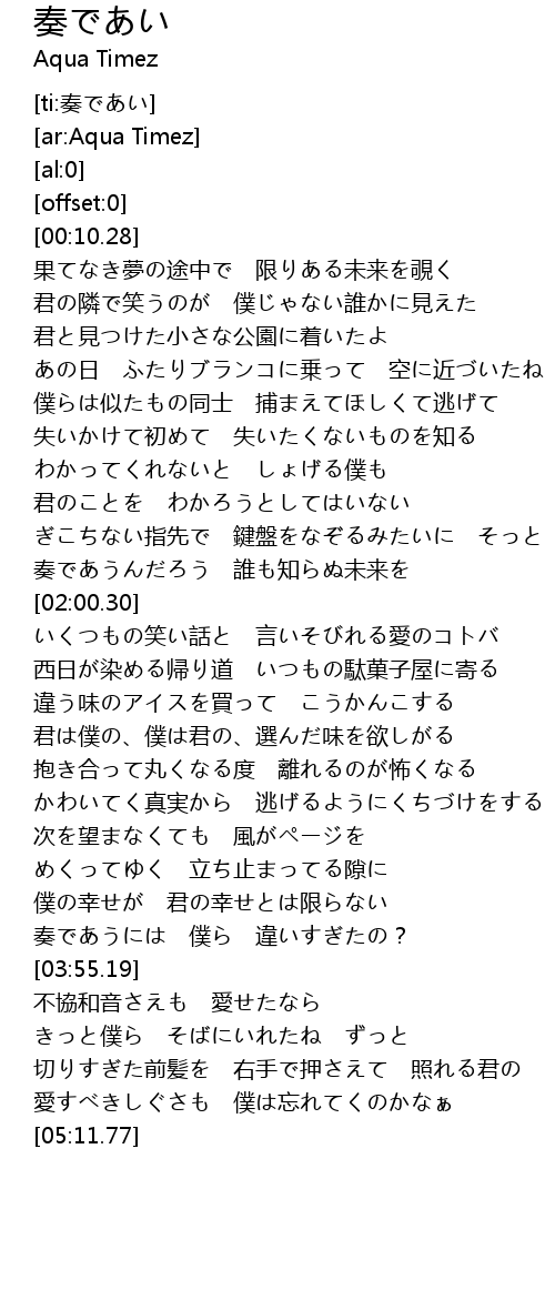 | [03:43.87] | 奏であうには 僕ら 違いすぎたの? |