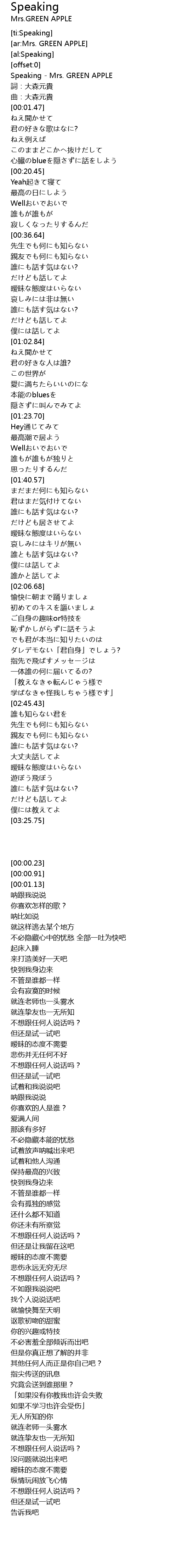 | [00:00.23] | Speaking Mrs. GREEN APPLE |