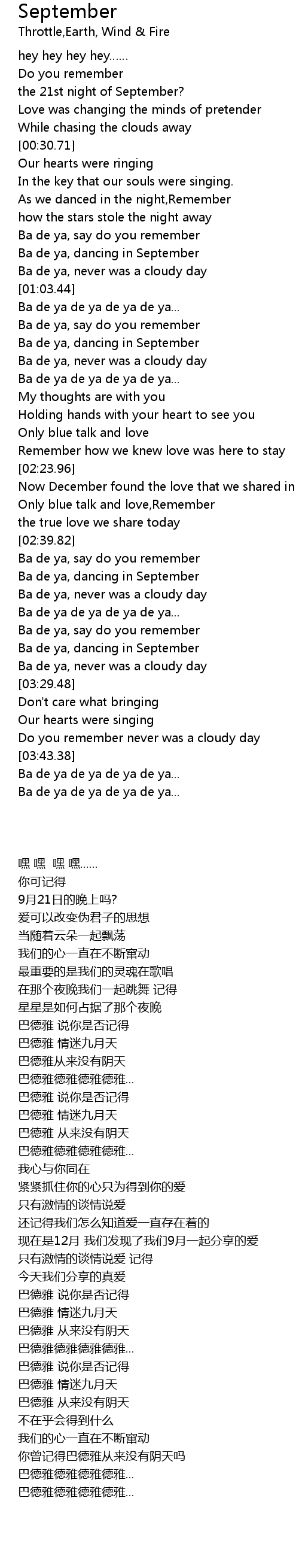 | [03:17.26] | Ba de ya, dancing in September |