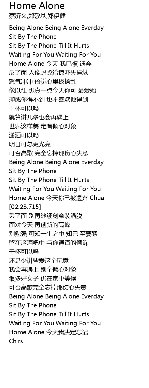 | [02:11.193] | Home Alone 今天你已被遗弃 Chua |