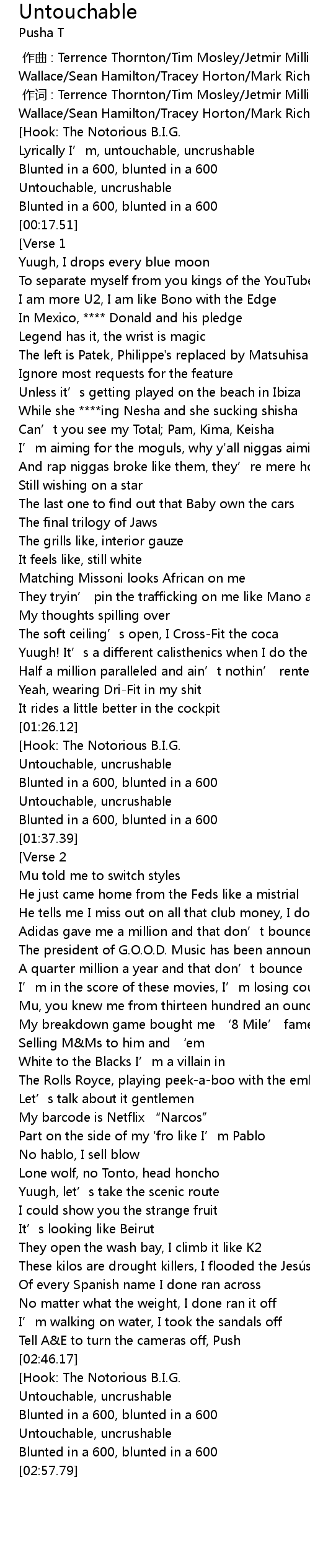 | [00:00.00] | 作曲 : Terrence Thornton/Tim Mosley/Jetmir Milli Salii/Christopher Wallace/Sean Hamilton/Tracey Horton/Mark Richardson |
