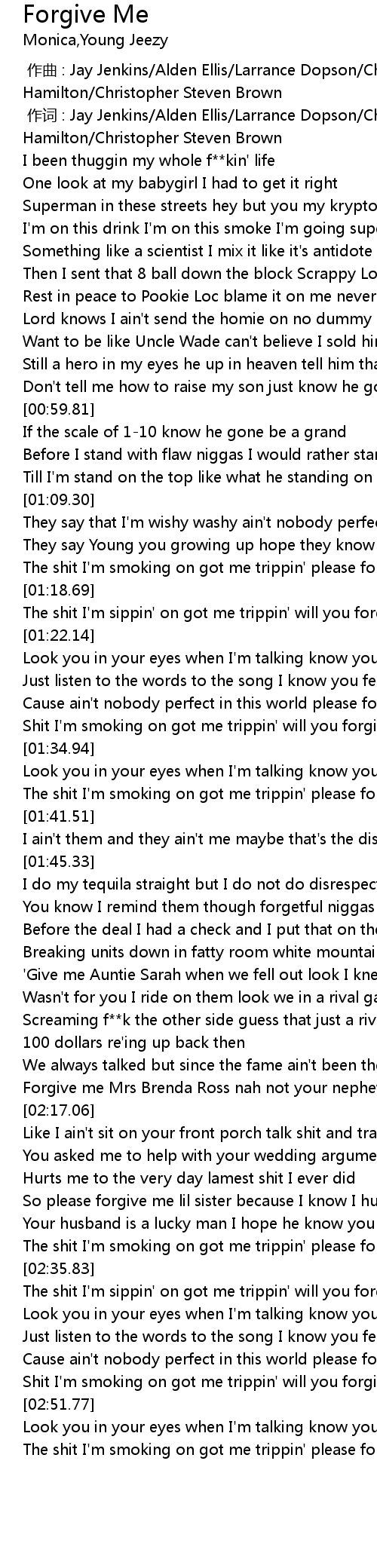 | [01:32.16] | Shit I'm smoking on got me trippin' will you forgive me |