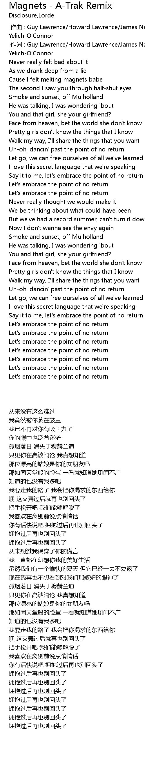 | [01:21.76] | Let' s embrace the point of no return |