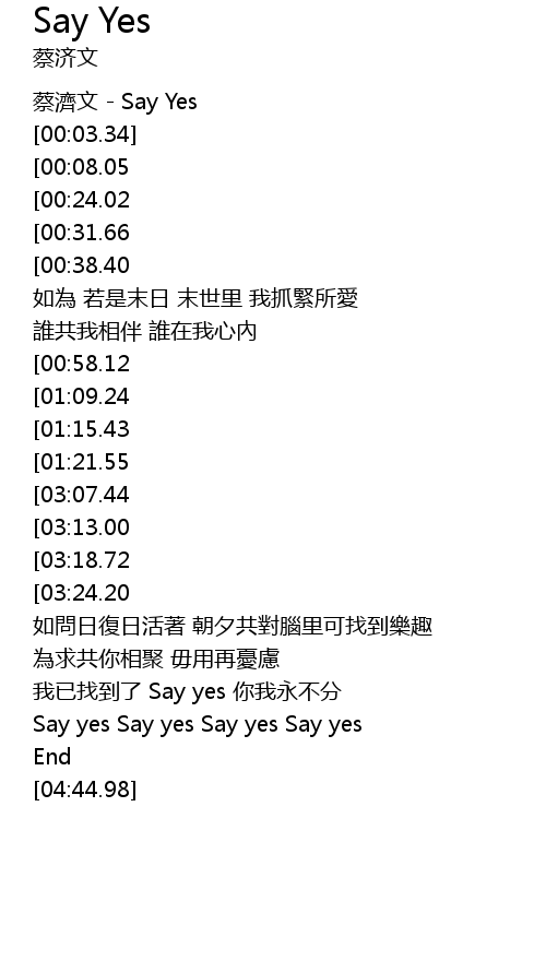 | [00:00.00] | 蔡濟文 - Say Yes |