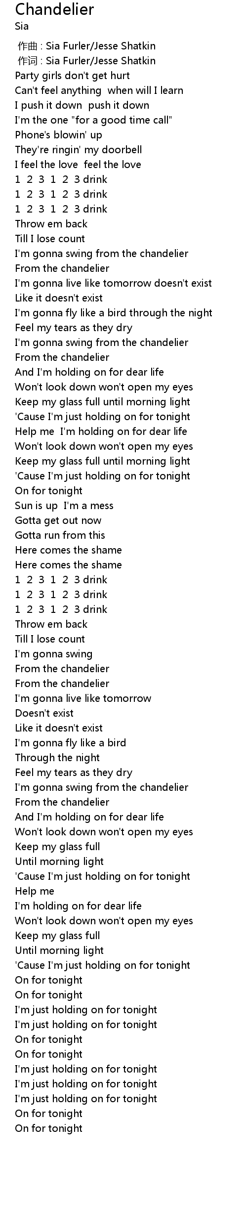 | [00:33.67] | I' m gonna swing from the chandelier |