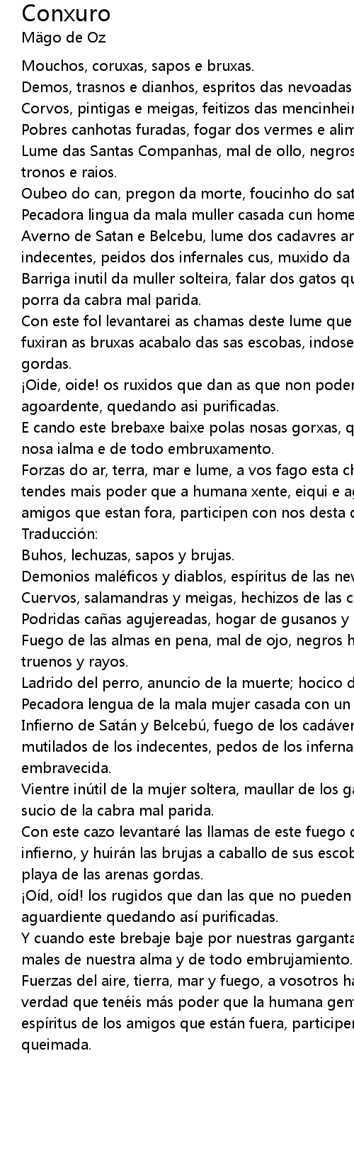 | Forzas do ar, terra, mar e lume, a vos fago esta chamada: si e verdade que tendes mais poder que a humana xente, eiqui e agora, facede cos espritos dos amigos que estan fora, participen con nos desta queimada. | |