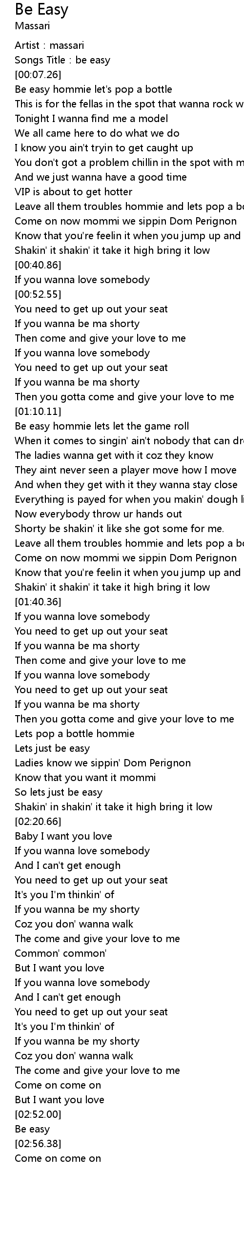 | [00:10.28] | Be easy hommie let' s pop a bottle |