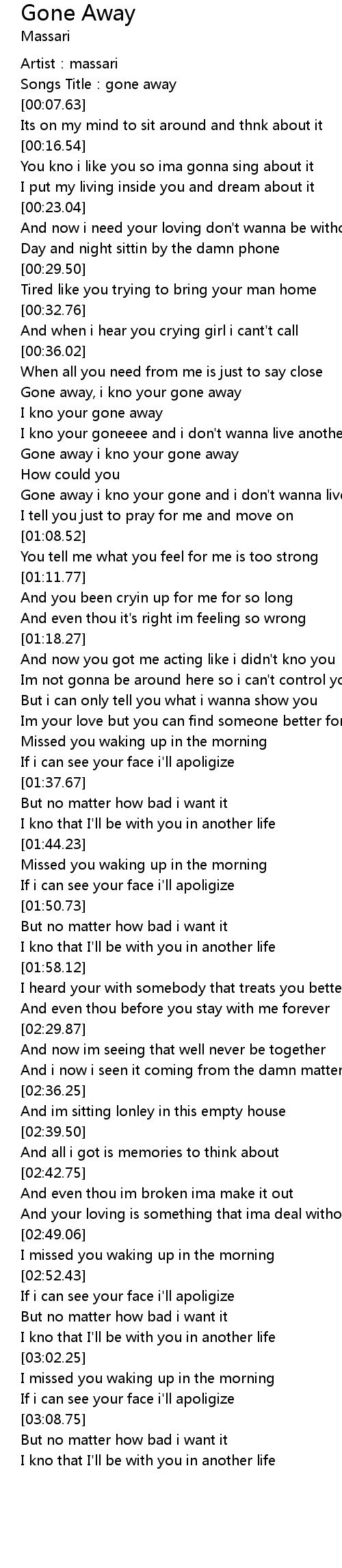 | [00:44.64] | I kno your gone away |