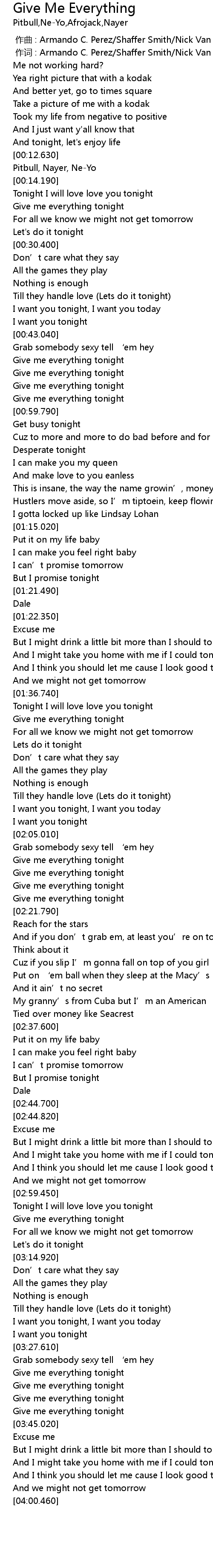 | [00:00.373] | 作词 : Armando C. Perez/Shaffer Smith/Nick Van De Wall |