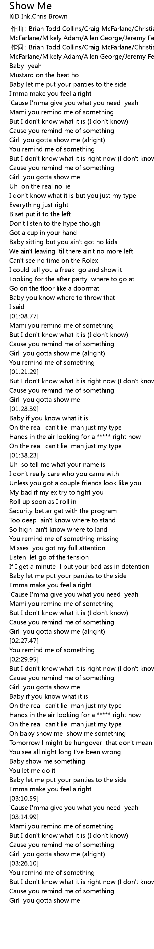 | [00:01.00] | 作词 : Brian Todd Collins/Craig McFarlane/Christian Jones/Dijon McFarlane/Mikely Adam/Allen George/Jeremy Felton/Chris Brown |
