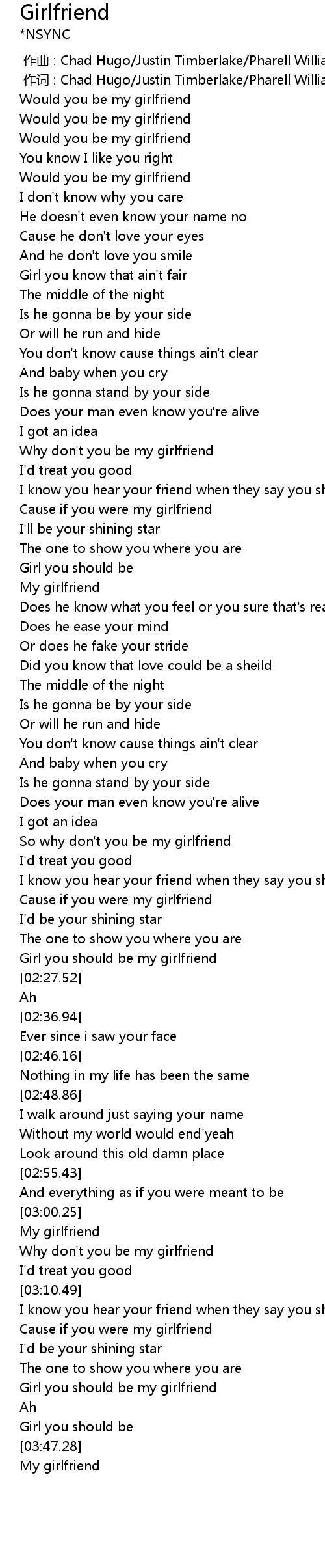 | [03:16.36] | Cause if you were my girlfriend |