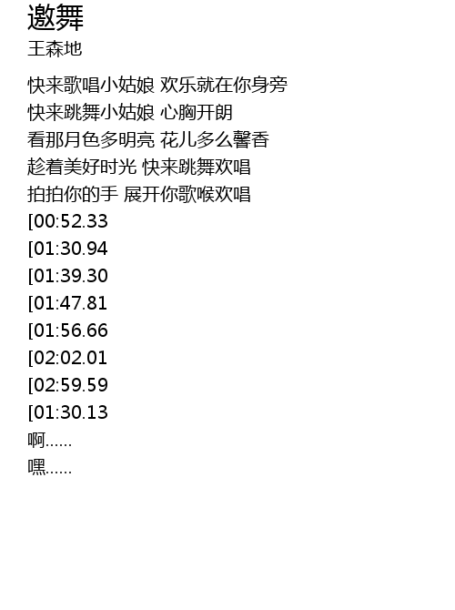 | [02:25.40][01:30.94][00:53.22] | 啊~ 让你歌声在山谷中回响 |