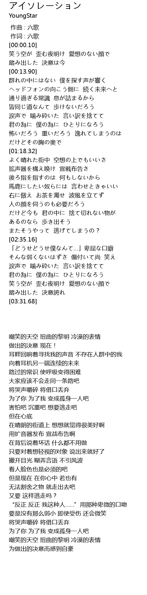 | [00:00.53] | 笑う空が 歪む夜明け 愛想のない顔で |
