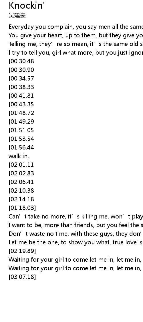| [02:39.81][01:53.54][00:50.05] | Knocking on your door, knocking, knocking |