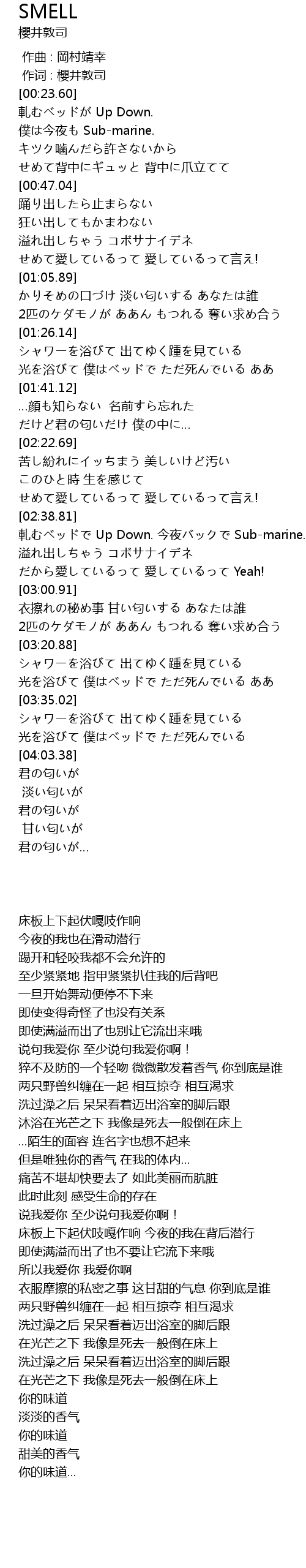 | [02:45.02] | 軋むベッドで Up Down. 今夜バックで Sub-marine. |