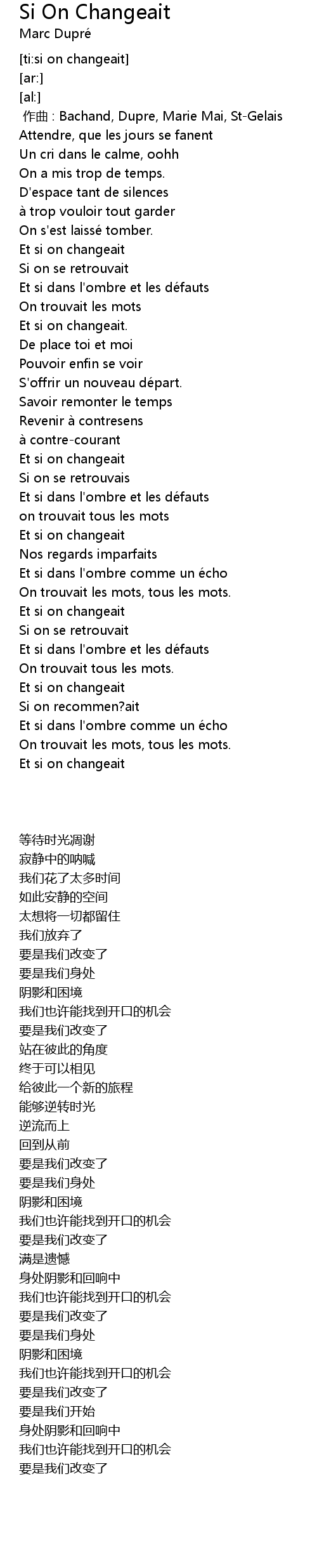 | [00:00.00] | 作曲 : Bachand, Dupre, Marie Mai, St-Gelais |