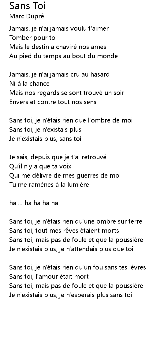| Sans toi, je n'é tais rien qu' un fou sans tes lè vres | |