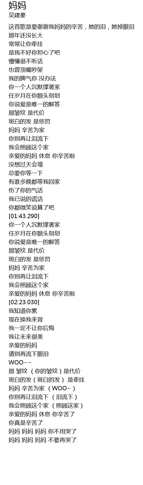 | [00:05.339] | 这首歌是要谢谢我妈妈的辛苦,她的泪,她掉眼泪 |