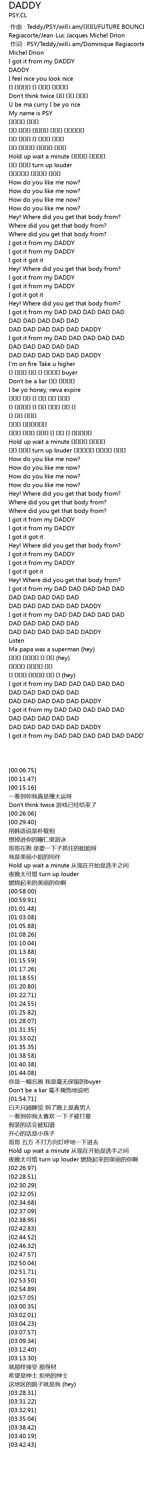 | [00:00.00] | zuo qu : Teddy PSY will. i. am FUTURE BOUNCE Dominique Regiacorte JeanLuc Jacques Michel Drion |