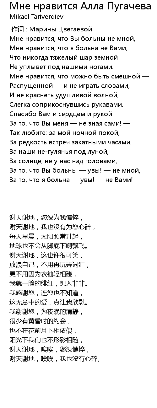 | 歌曲 | Мне нравится Алла Пугачева |