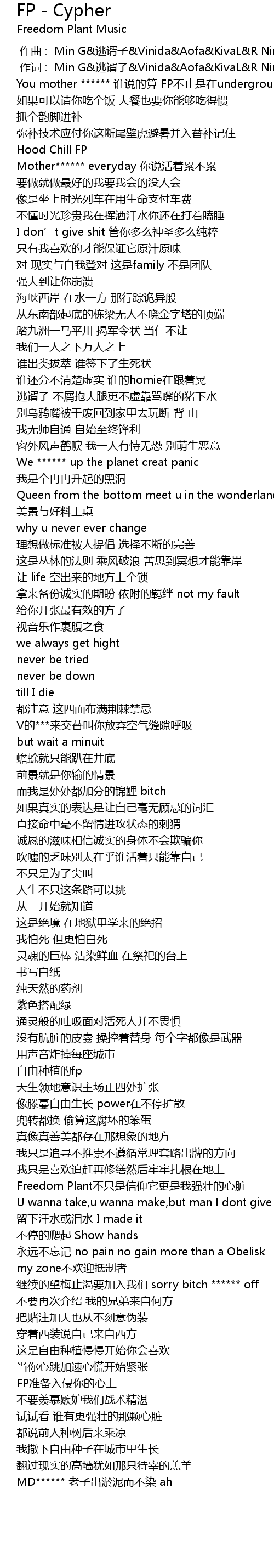 | [00:22.61] | You mother ****** 谁说的算 FP不止是在underground |