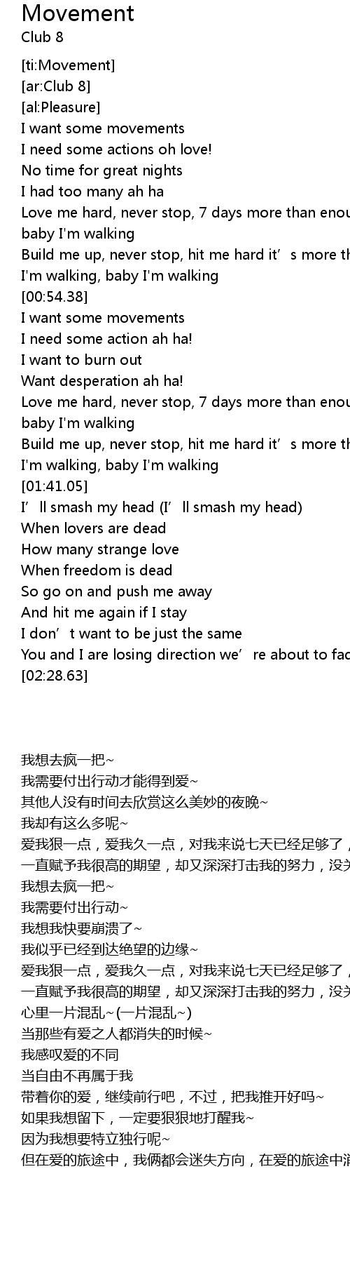 | [00:44.69] | Build me up, never stop, hit me hard it' s more than enough, still I' m walking, baby I' m walking |