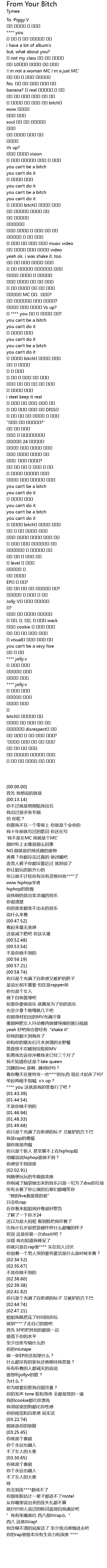 | [02:06.28] | 你削减了脑袋做出来的音乐只是一坨为了diss的垃圾 |