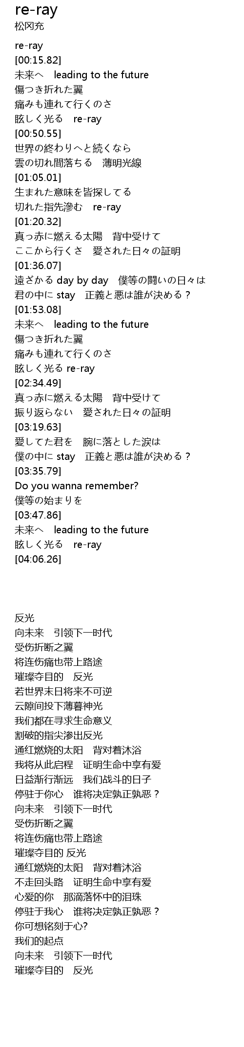 | [00:42.68] | 眩しく光る re-ray |