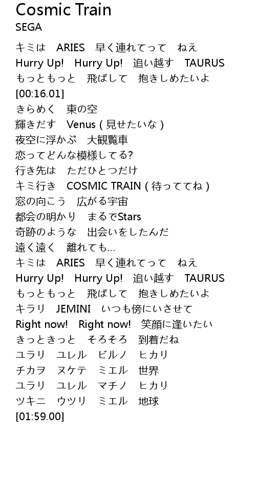 | [00:48.61] | キミ行き COSMIC TRAIN(待っててね) |
