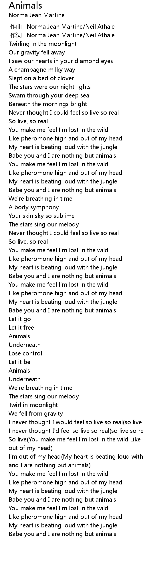 | [02:57.39] | I' m out of my head My heart is beating loud with the jungle Babe you and I are nothing but animals |