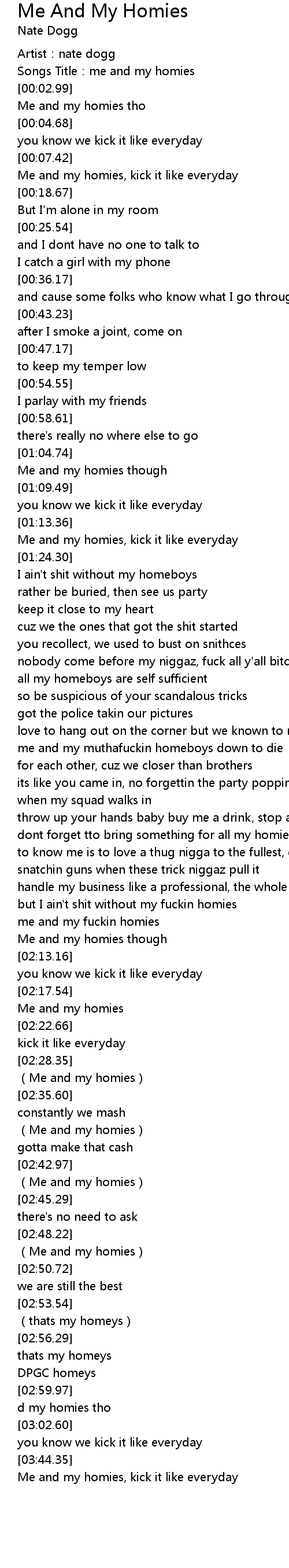 | [01:16.49] | Me and my homies, kick it like everyday |