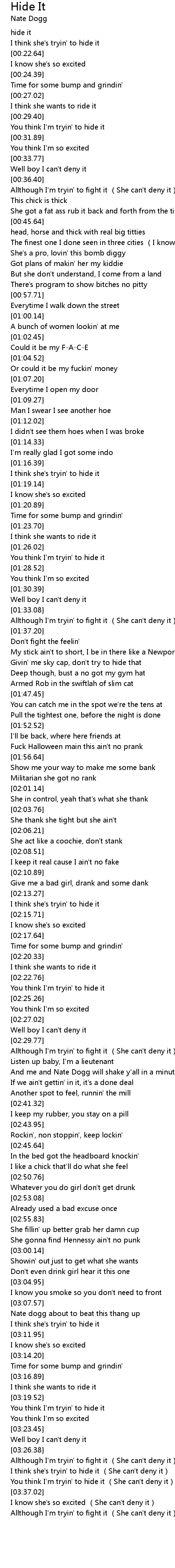 | [00:42.20] | She got a fat ass rub it back and forth from the tip of my dick |