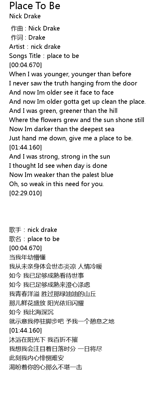 | [00:02.460] | Songs Title:place to be |