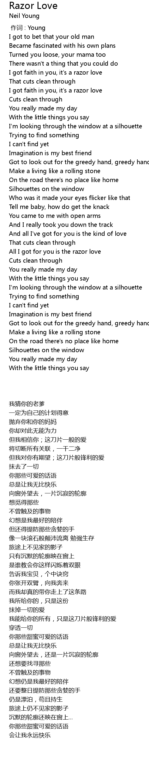 | [01:34.11] | I got faith in you, it' s a razor love |