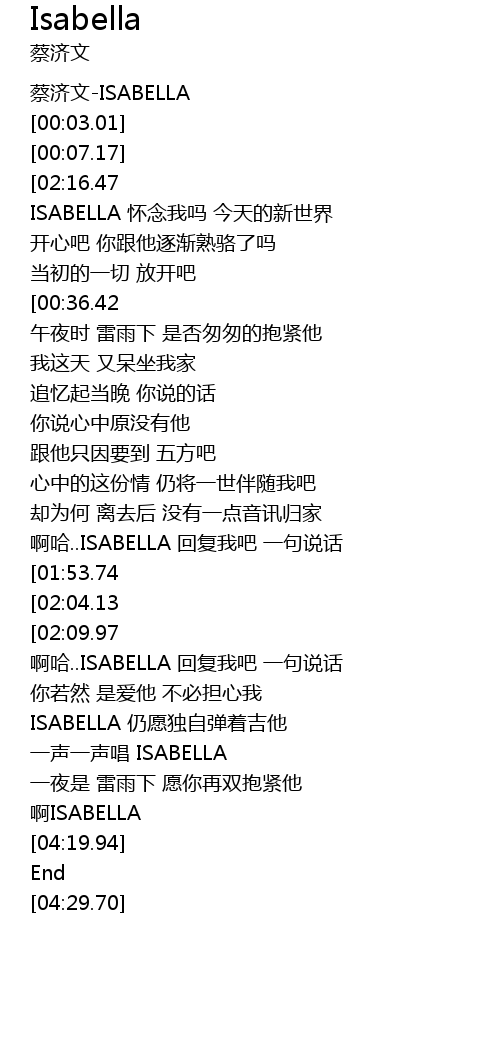| [03:19.71] | ISABELLA 仍愿独自弹着吉他 |