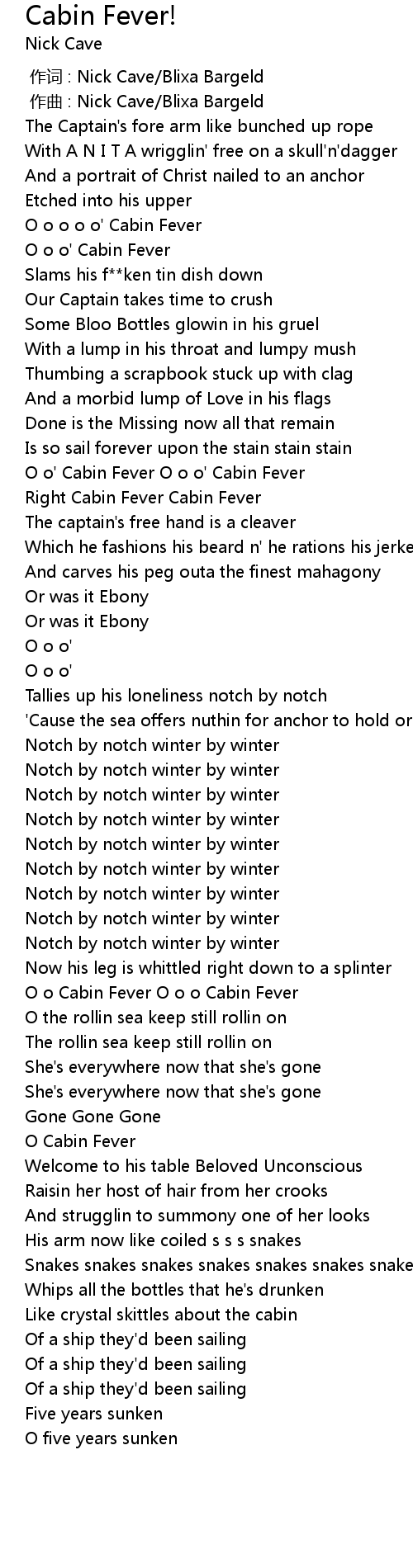 | [01:51.90] | O o' Cabin Fever O o o' Cabin Fever |