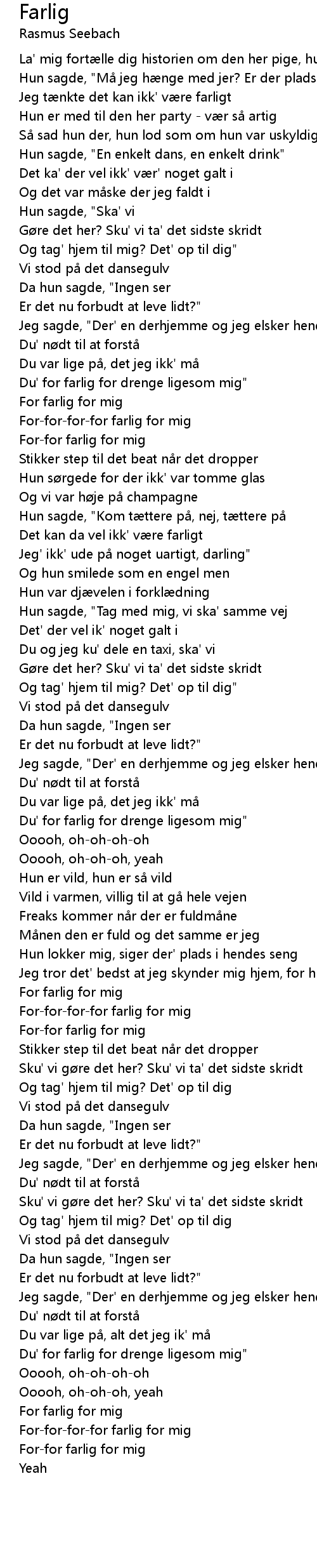 | [01:01.82] | For-for-for-for farlig for mig |