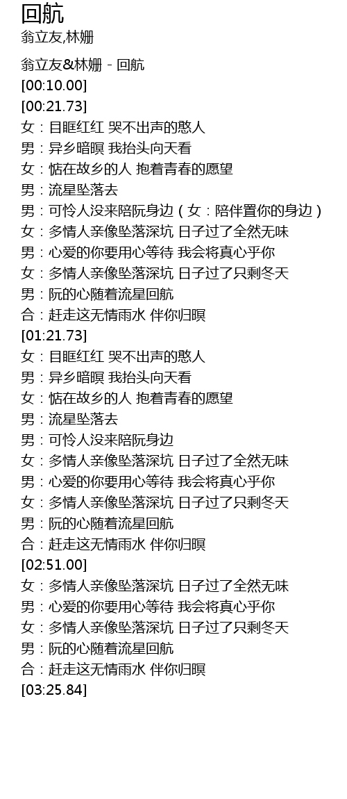 | [00:00.00] | 翁立友&林姗 - 回航 |