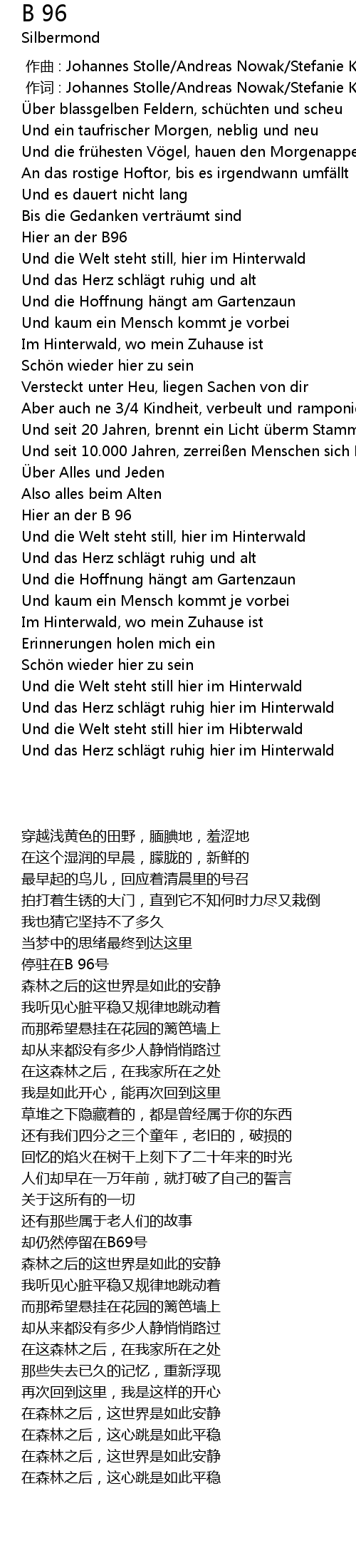 | [00:01.00] | 作词 : Johannes Stolle/Andreas Nowak/Stefanie Kloß/Thomas Stolle |