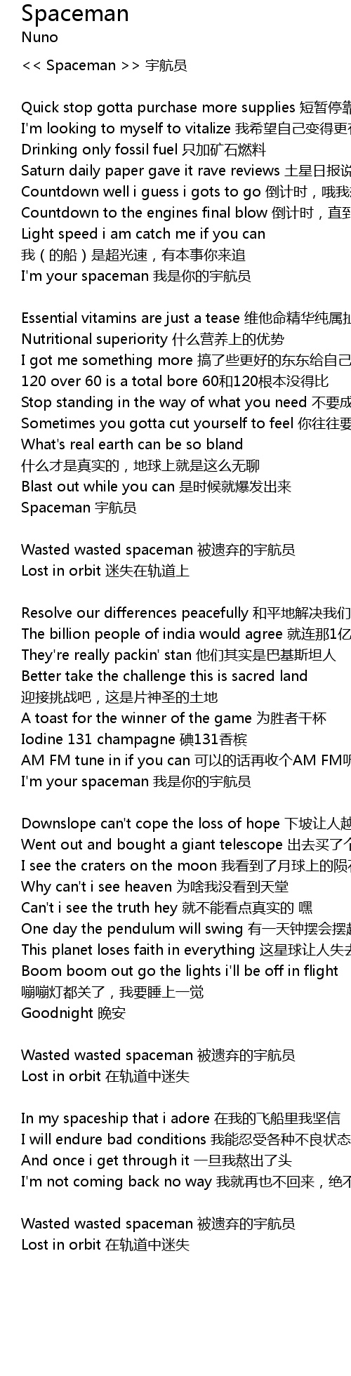 | I' m your spaceman wǒ shì nǐ de yǔ háng yuán | |