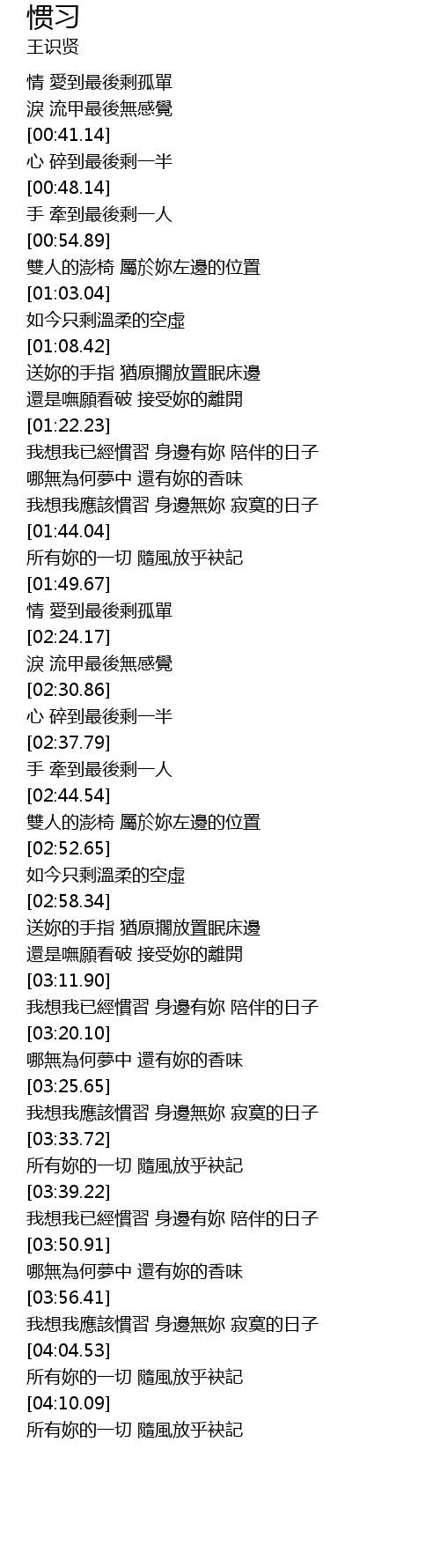 | [03:58.91] | 我想我應該慣習 身邊無妳 寂寞的日子 |