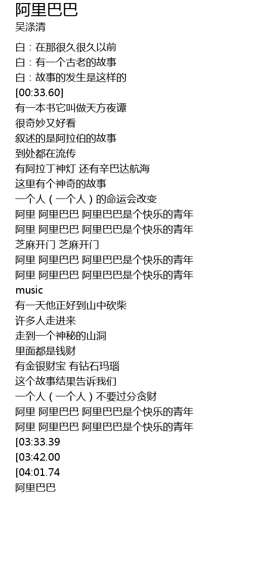 | [01:35.58] | 阿里 阿里巴巴 阿里巴巴是个快乐的青年 |