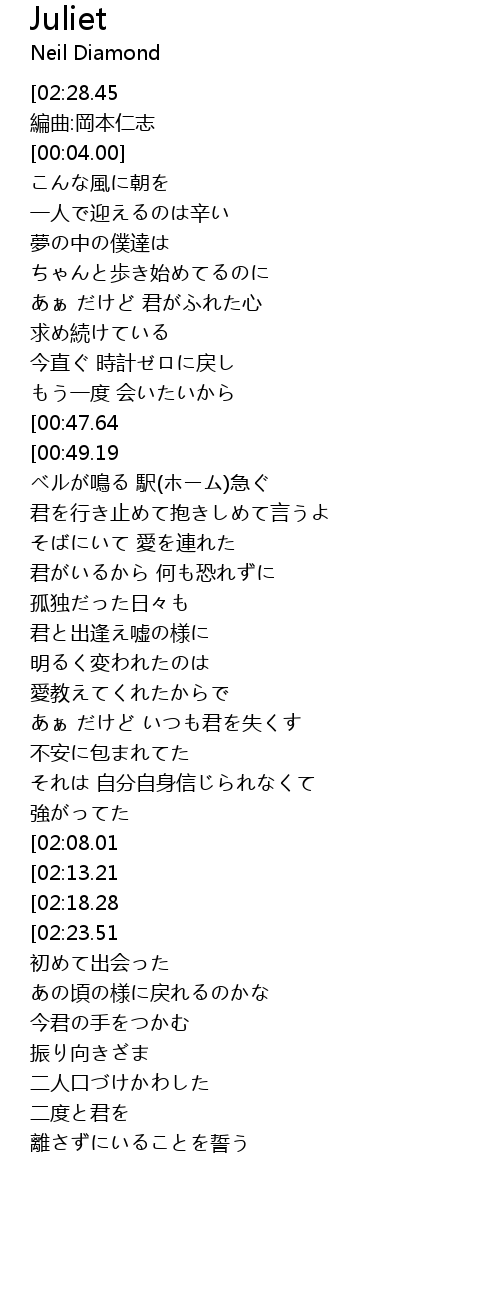 | [03:18.76][02:28.45][01:11.24][00:00.00] | Juliet |