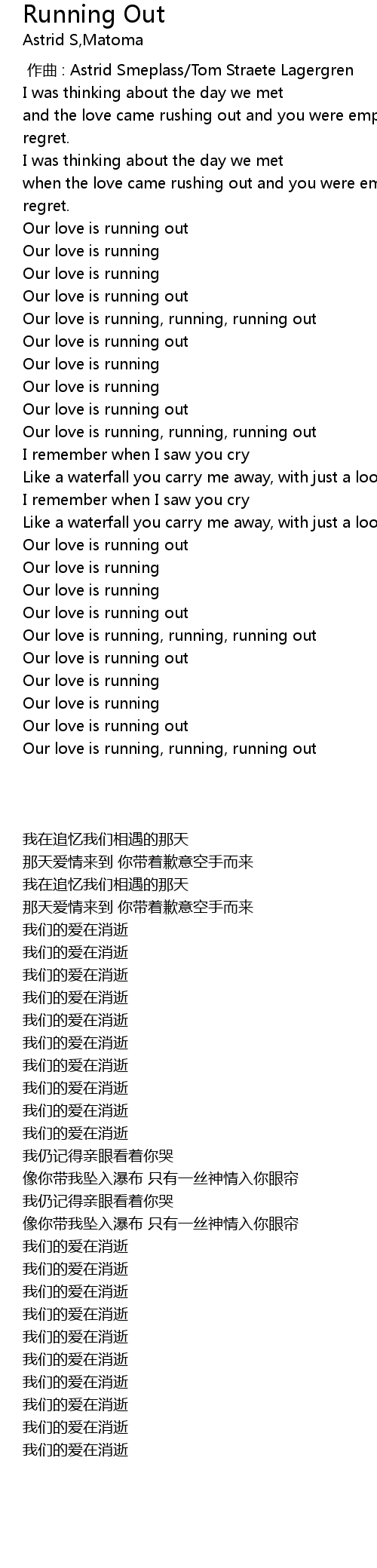 | [02:16.98] | Our love is running, running, running out |