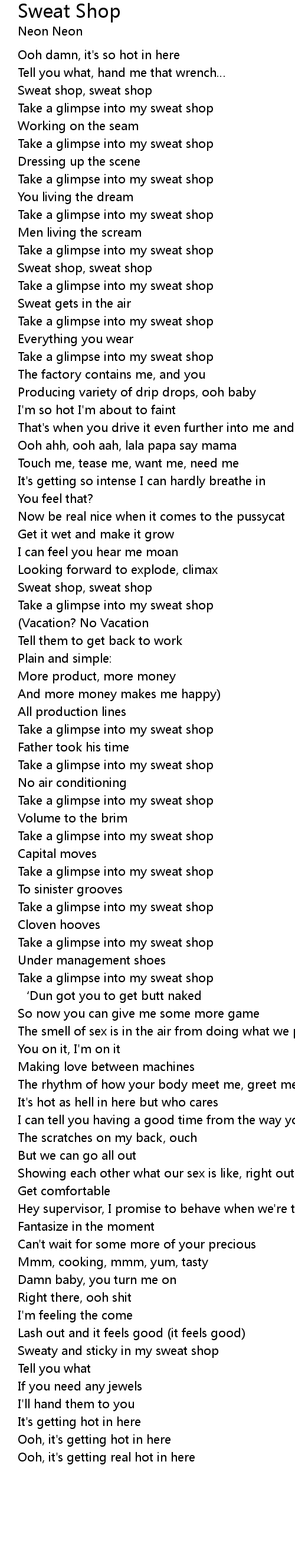 | Sweat shop, sweat shop | |