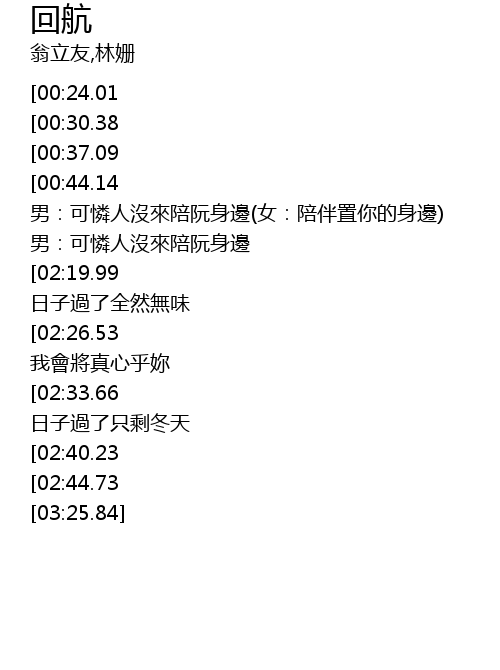 | [02:54.07][02:19.99][00:50.75] | 女:多情人親像墜落深坑 日子過了全然無味 |