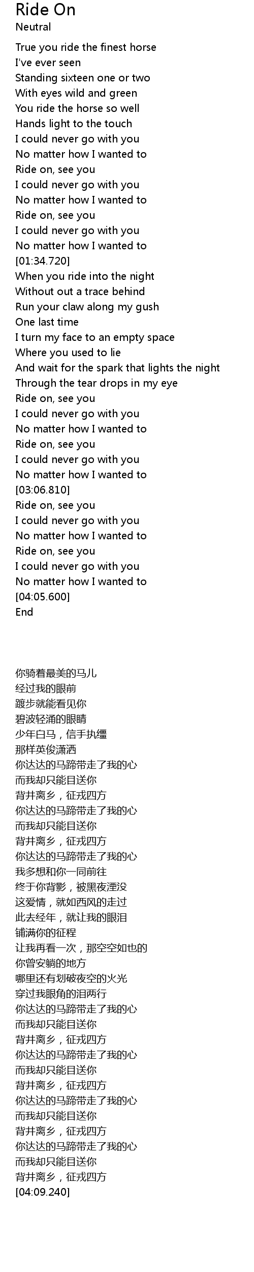 | [03:35.170] | 你达达的马蹄带走了我的心 |