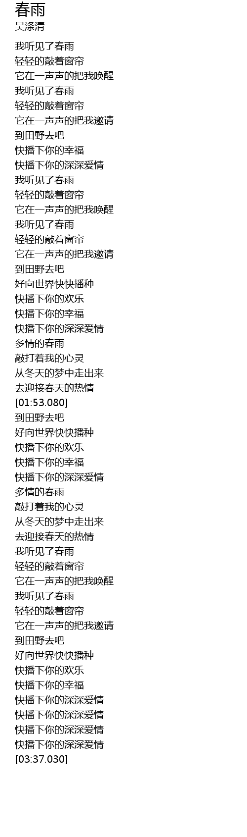 | [00:59.280] | wǒ tīng jiàn le chūn yǔ |